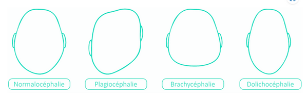 Déformation du crâne type plagiocéphalie : par exemple, le côté droit du crâne de bébé est bombé, le côté gauche est aplati